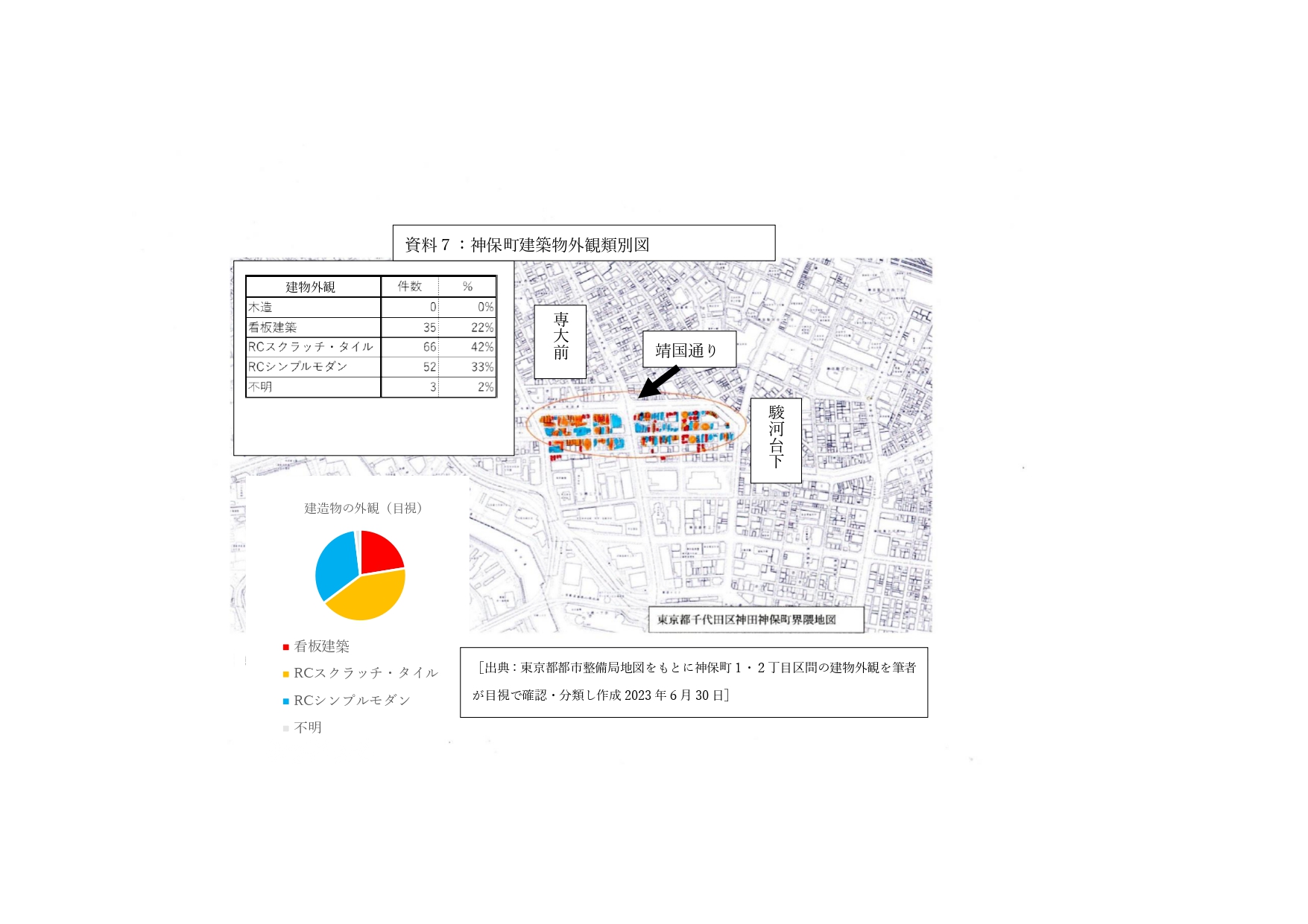[資料7:出典・東京都都市整備局(IX-LD18-1 29-12 北の丸公園)東京都地形図1:2500(平成25年7月現地調査)をもとに神保町1丁目・2丁目界隈の建物外観(現在)を筆者が目視で確認・分類し、加工して作成、2023年6月30日] -