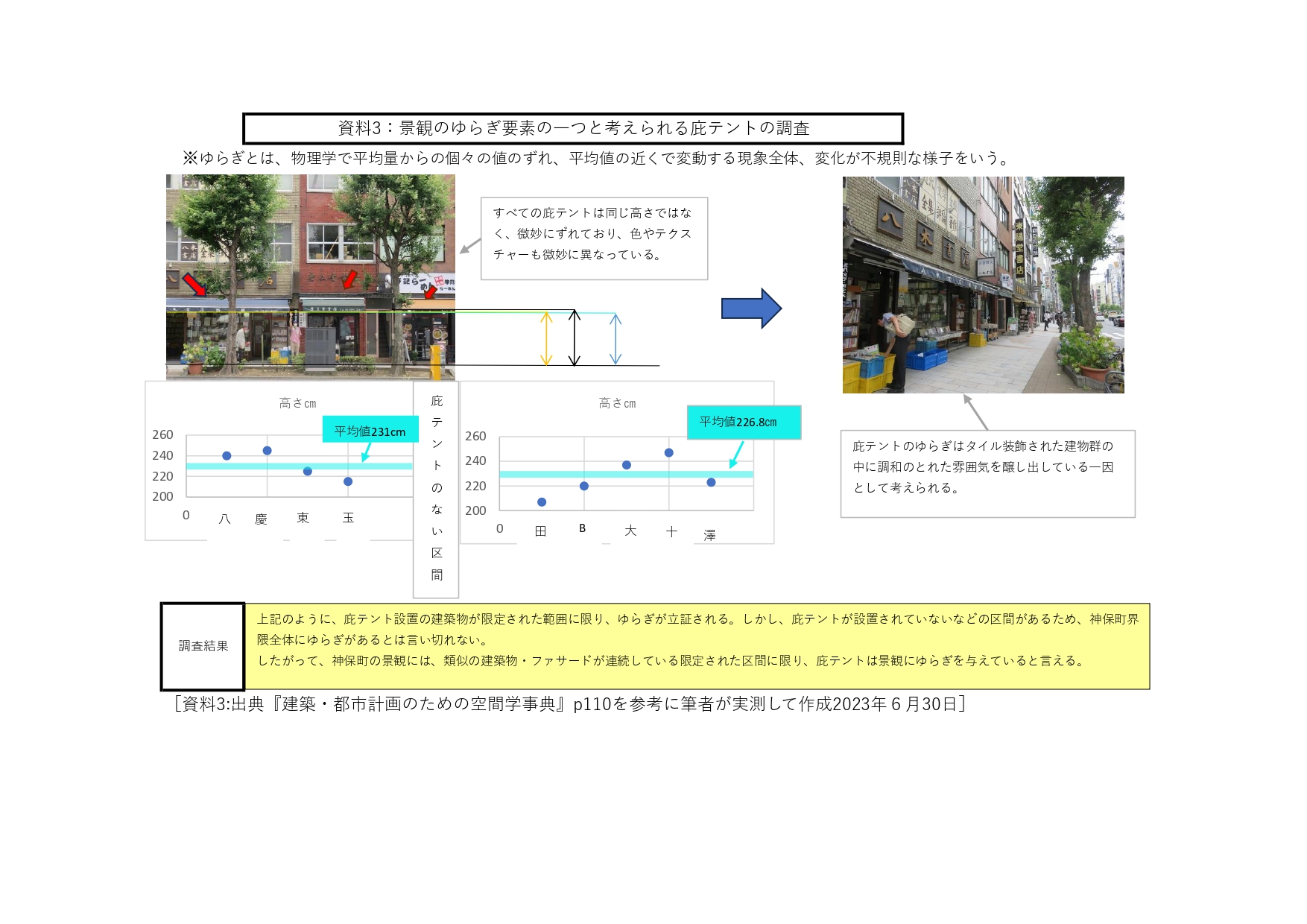 [資料3:出典・日本建築学会編『建築・都市計画のための空間学事典』、p110を参考に筆者が庇テントの高さを実測して作成、2023年6月30日] -