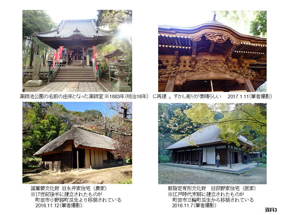 町田市は、現在も「町田市緑の基本計画2020」や市民の意識調査をしながら公園整備を進めているが、町田市を代表する公園として後世に残していくためには、二次的自然や文化財の維持・管理を担う人材育成や薬師池公園を知らない人々に対して、公園の魅力を情報発信していくシステム作りも必要だと考える。