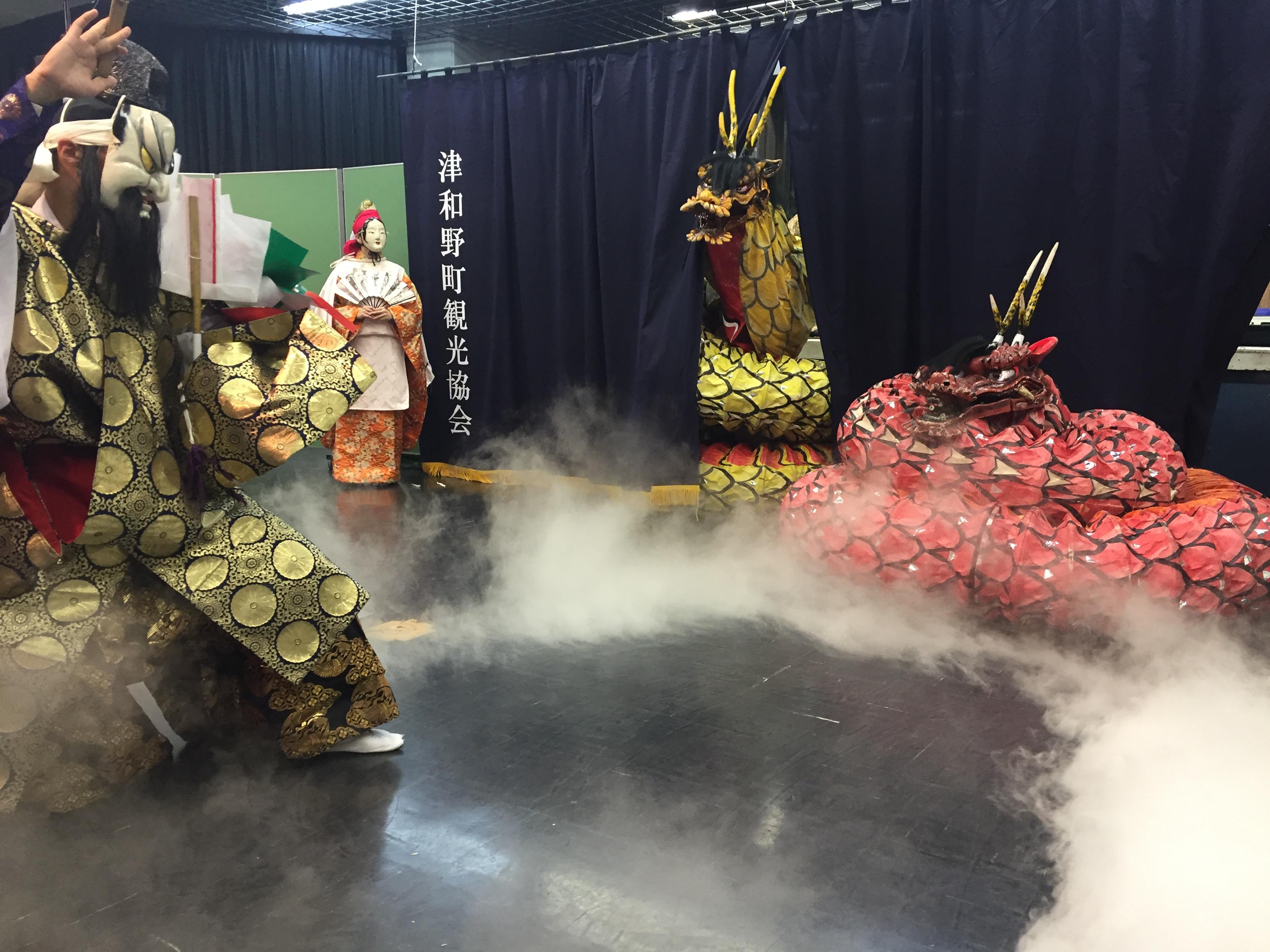 津和野の夜神楽 石見神楽左鐙社中による「大蛇」の一場面(H28.8.20撮影) 神楽の舞台でドライアイスがたかれることに大変驚き、石見神楽が伝統のみを守っているのではないことに気が付いた。 -