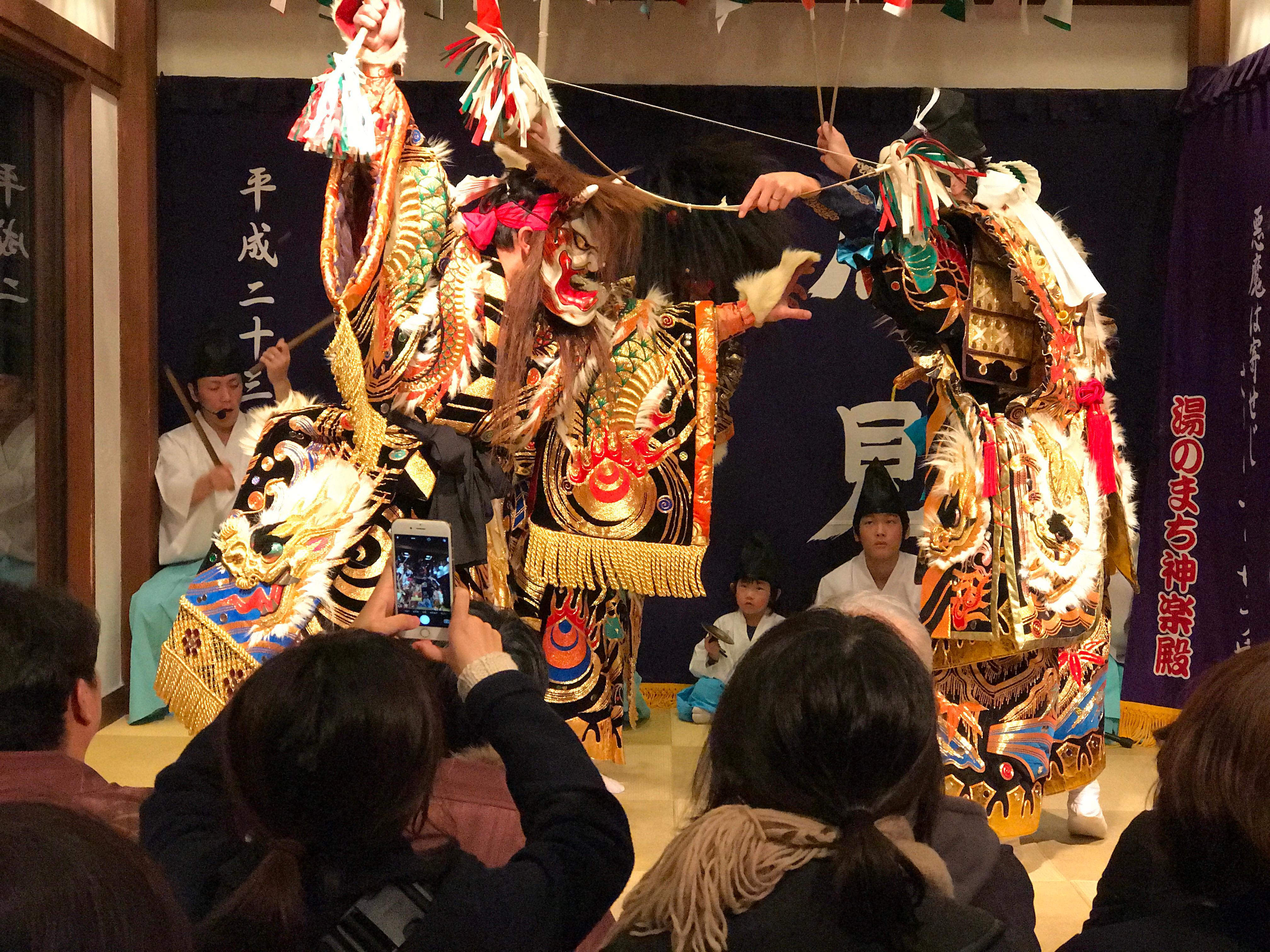 一観光客である筆者が、石見神楽と出会ったのは観光地などで夜に上演される夜神楽公演であった。平成28年の夏に山陰の京都津和野を、冬に美人・美肌の湯で知られる有福温泉を訪れ公演を観賞した。どちらの公演も、地元の神楽団が旅館近くの会場で上演を行い、会場には浴衣姿の観光客をはじめ地元の人々等30名程が集まり客席はほぼ満員であった。津和野では石見神楽左鐙社中の「鍾馗」と「大蛇」を、有福温泉では有福温泉神楽団の「塵輪」「恵比寿」「大蛇」を1~2時間程で鑑賞した。演目の間には、神楽や演目についての説明、上演後には衣装に触れたり、大蛇の蛇胴と記念撮影が出来るなど、料金1000円以下という手頃さで石見の文化を肌で感じることが出来た。