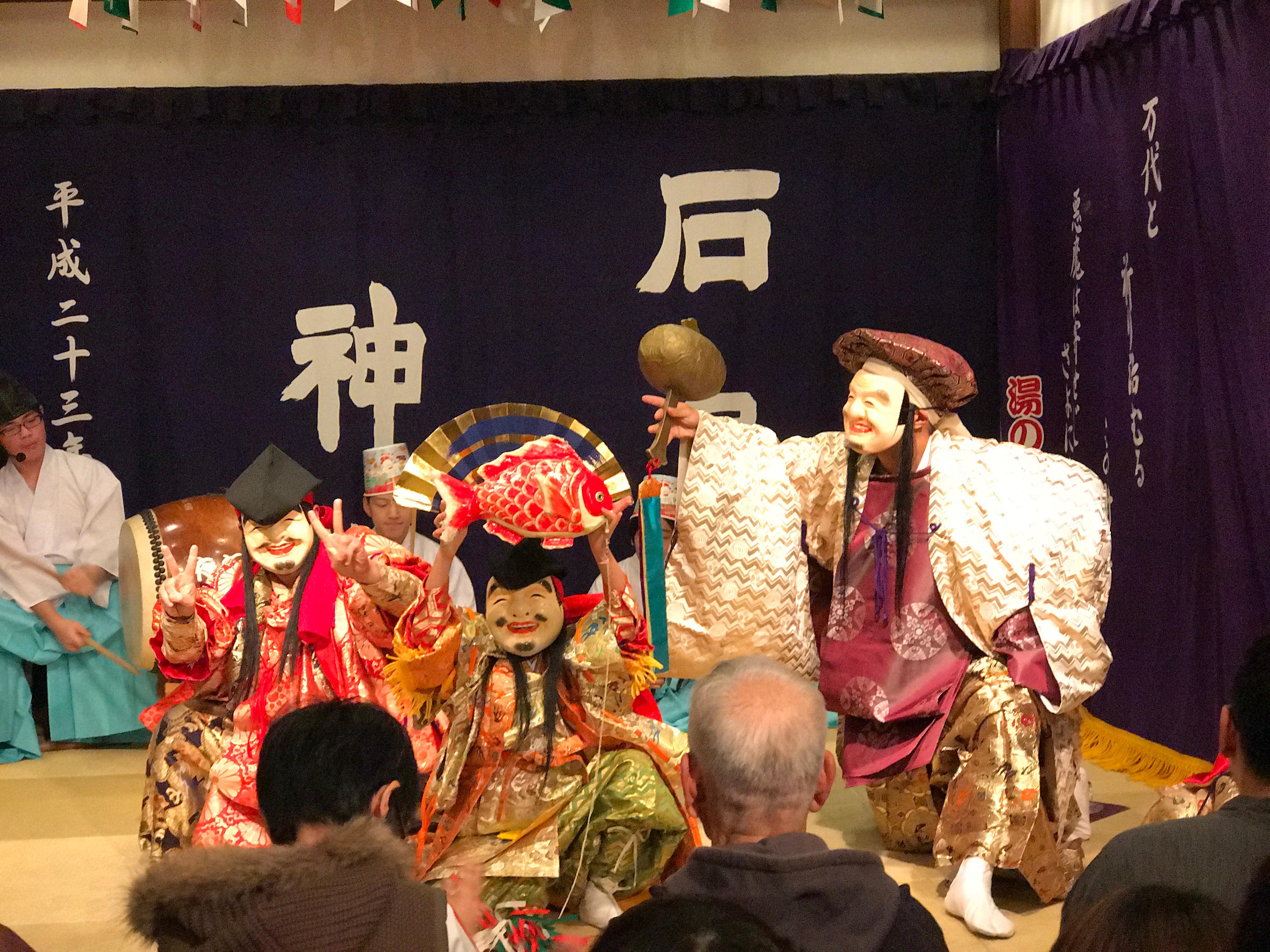 有福温泉神楽団の「恵比寿」の一場面(H28.12.24撮影) 恵比寿のコミカルな動きに会場中が笑いに包まれた。 -