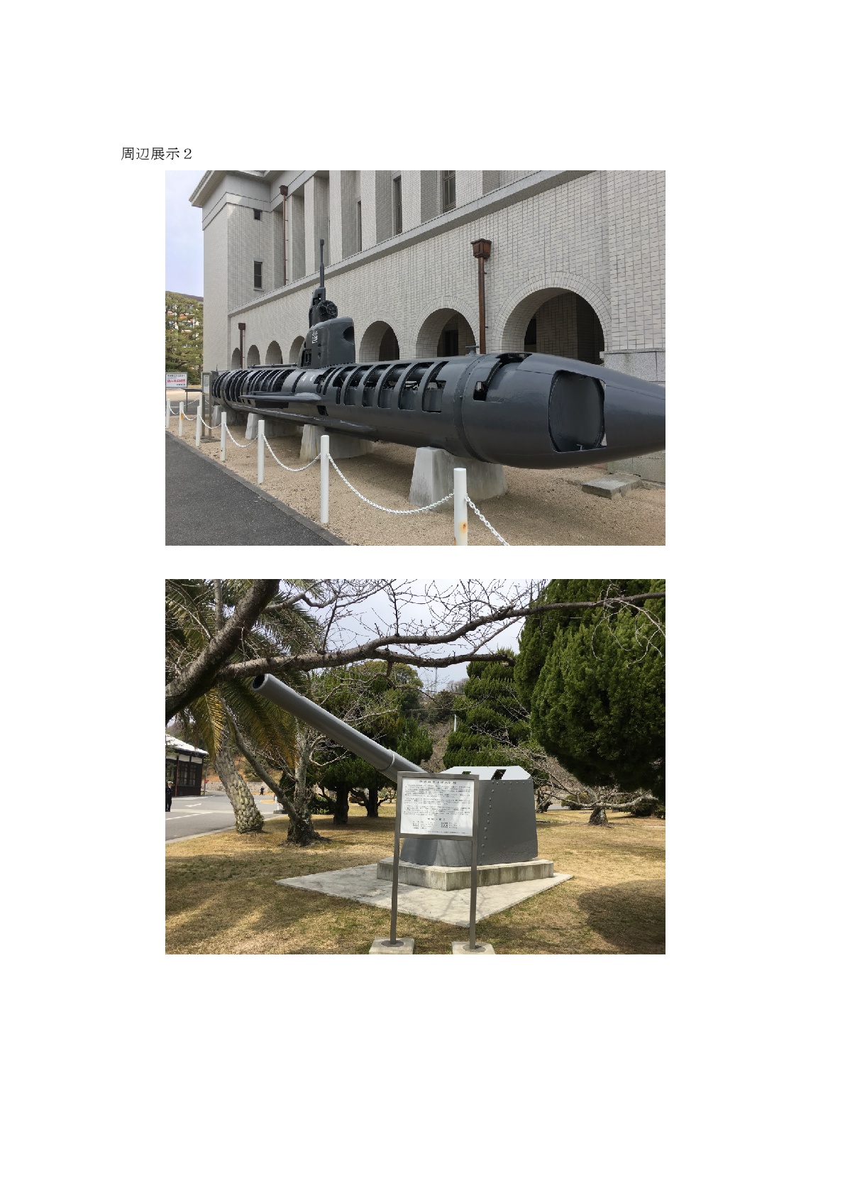 また、本館の周囲には、特殊潜航艇や戦艦「大和」の主砲弾などが展示されている。